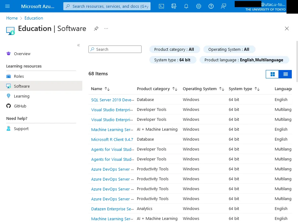 - The contents of the service (e.g., the lineup of software for developers) are subject to change according to the contents of the Microsoft service and the contract at the University of Tokyo.