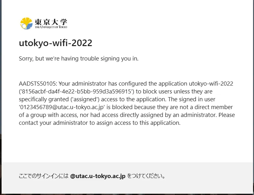 If you encounter an error message like the one shown in the image below (Error Code: AADSTS50105) and are unable to sign in to the UTokyo Wi-Fi account menu, it’s possible that you have not completed the required information security education to use UTokyo Wi-Fi. Please check the page for the Information Security Education, and complete and pass the confirmation test. Once you pass the test, the results will be immediately reflected in the system.