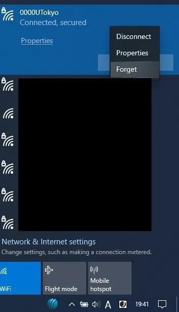 If the screen for entering a user-name and a password does not appear in Step 2 and it fails to connect to the Wi-Fi, you need to delete the existing setting and register a new one. This is necessary because although once you reissue your account and your previous account becomes invalid, your devices may still store it. Before using the new account, your devices must “forget” the previous one. There is no need to worry about never being able to connect to the UTokyo Wi-Fi again upon “deleting” a account.Right click the SSID you found in Step 2, select “Forget” from the displayed menu.