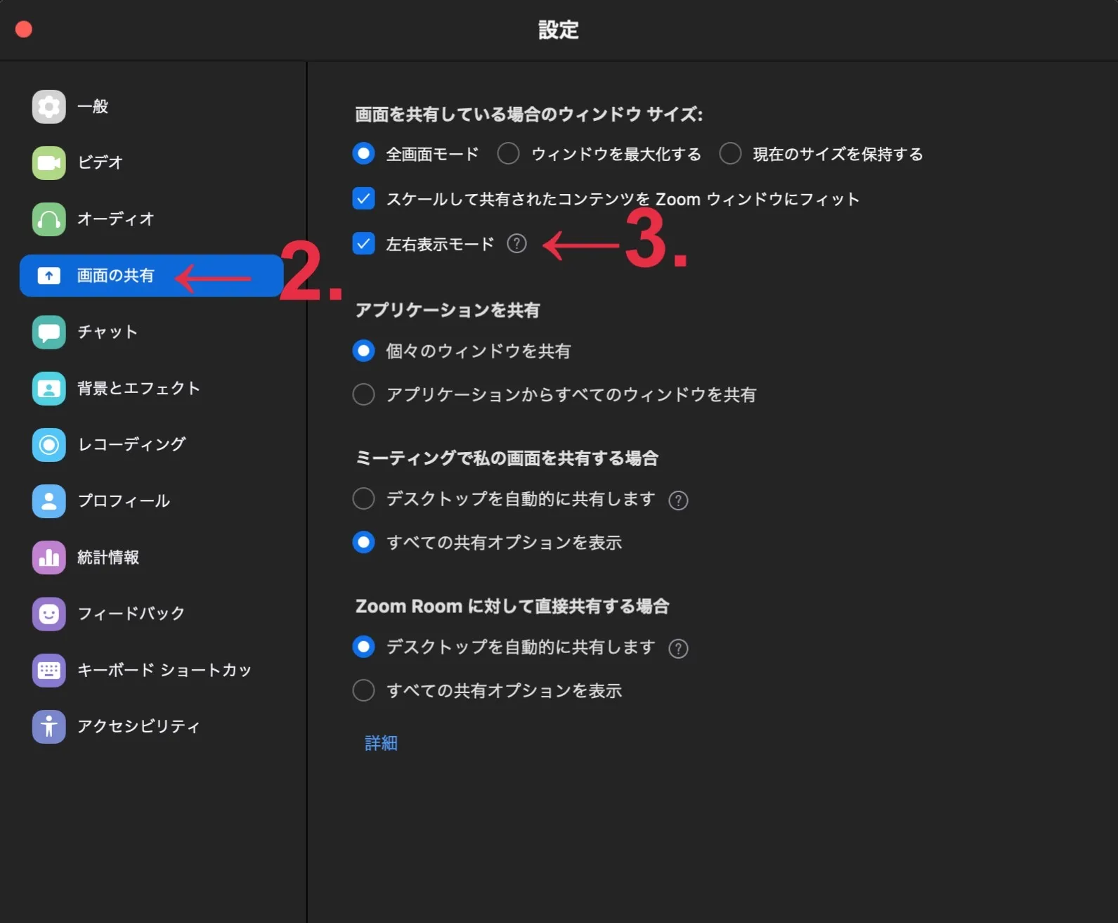 また,スポットライトを当てた学生の画面共有はデフォルトではホストにしか見えませんが,ホスト側が設定することで他の参加者にも表示させることが可能です.以下が設定手順です.